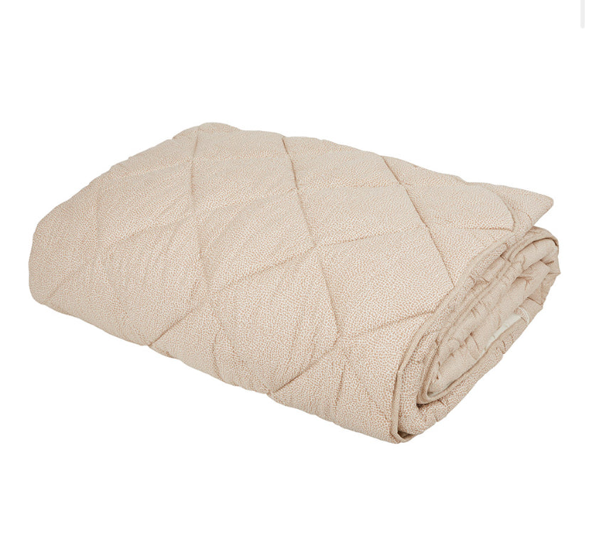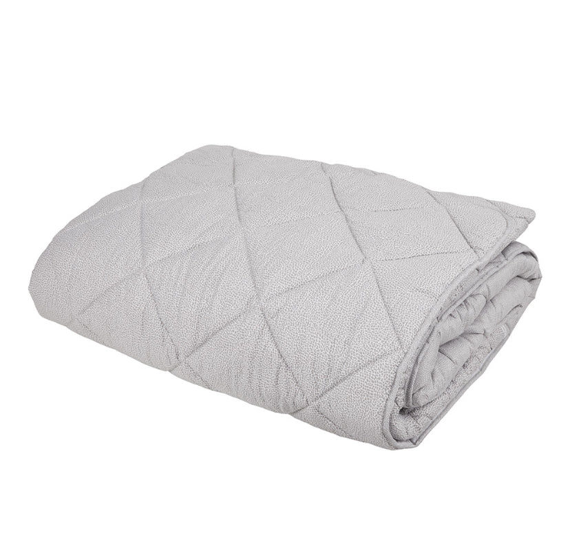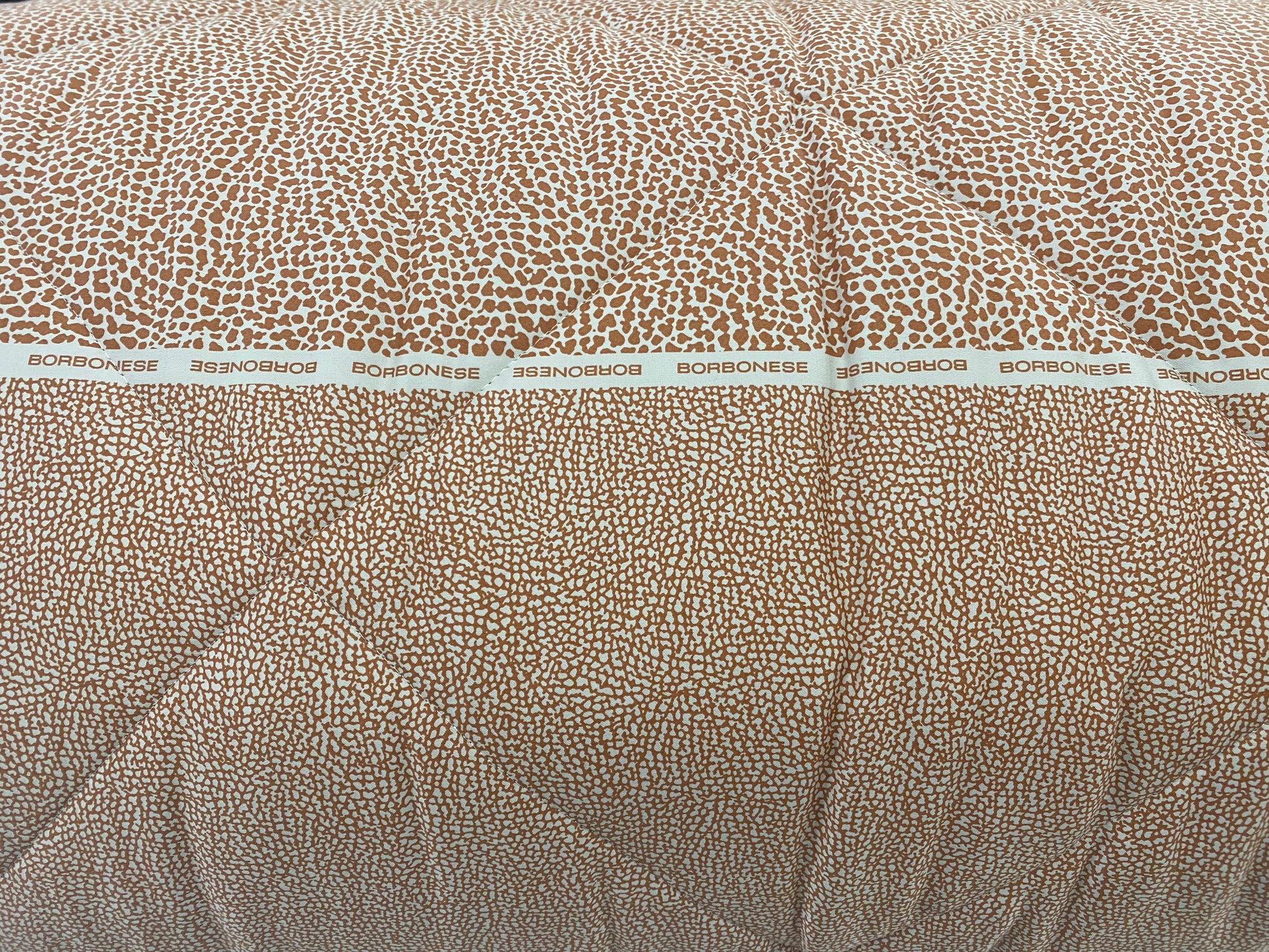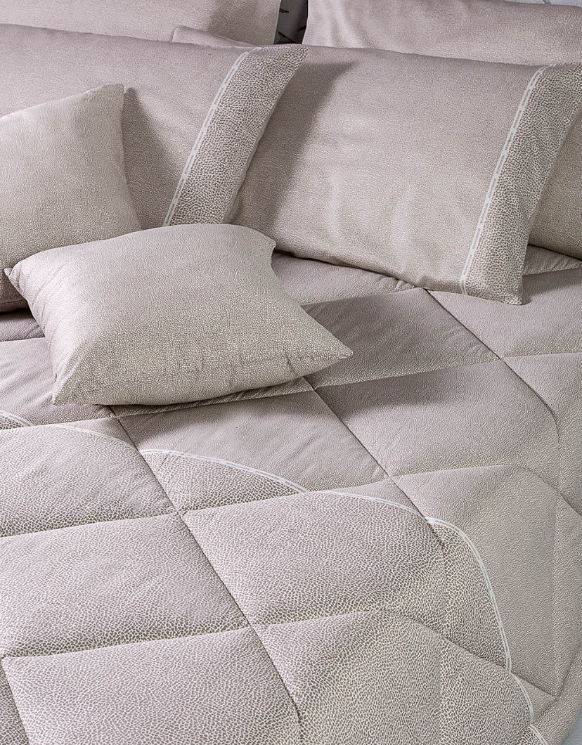Trapunta realizzata in raso di puro cotone 300 T.C. tinto e sovrastampato. La trapunta è stampata con l’iconico motivo “OP” Occhio di Pernice giocato in positivo e negativo. Sotto trapunta in tela tinta unita. La trapuntatura è a rombi in continuo, rifinita a mano con orlo sbieco e angoli stondati.