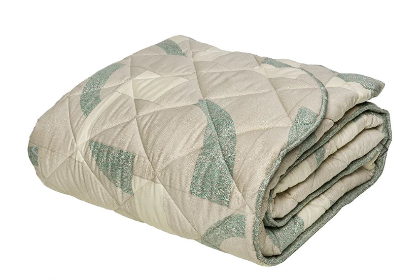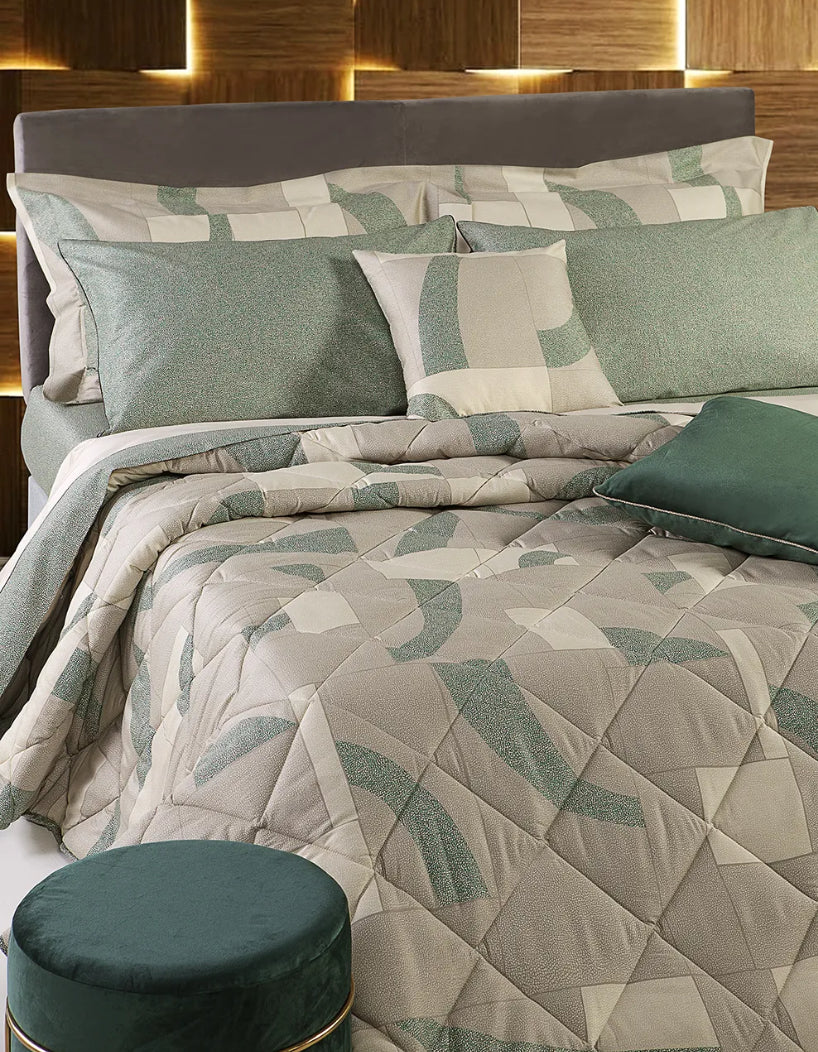 Trapunta in raso di puro cotone 300 T.C. double-face, stampata su entrambi i lati con design personalizzato dall’iconica texture “OP” Occhio di Pernice. La trapuntatura è a rombi in continuo rifinita a mano con orlo in sbieco e angoli stondati.