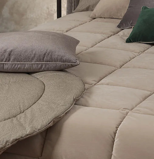 Trapunta double-face in morbido velluto. La parte superiore è in velluto tinta unita; la parte inferiore è in percalle di puro cotone 200 T.C. stampata con design personalizzato dall’iconica texture “OP” Occhio di Pernice. La trapuntatura piazzata esalta il raffinato disegno; rifinita a mano con angoli stondati.